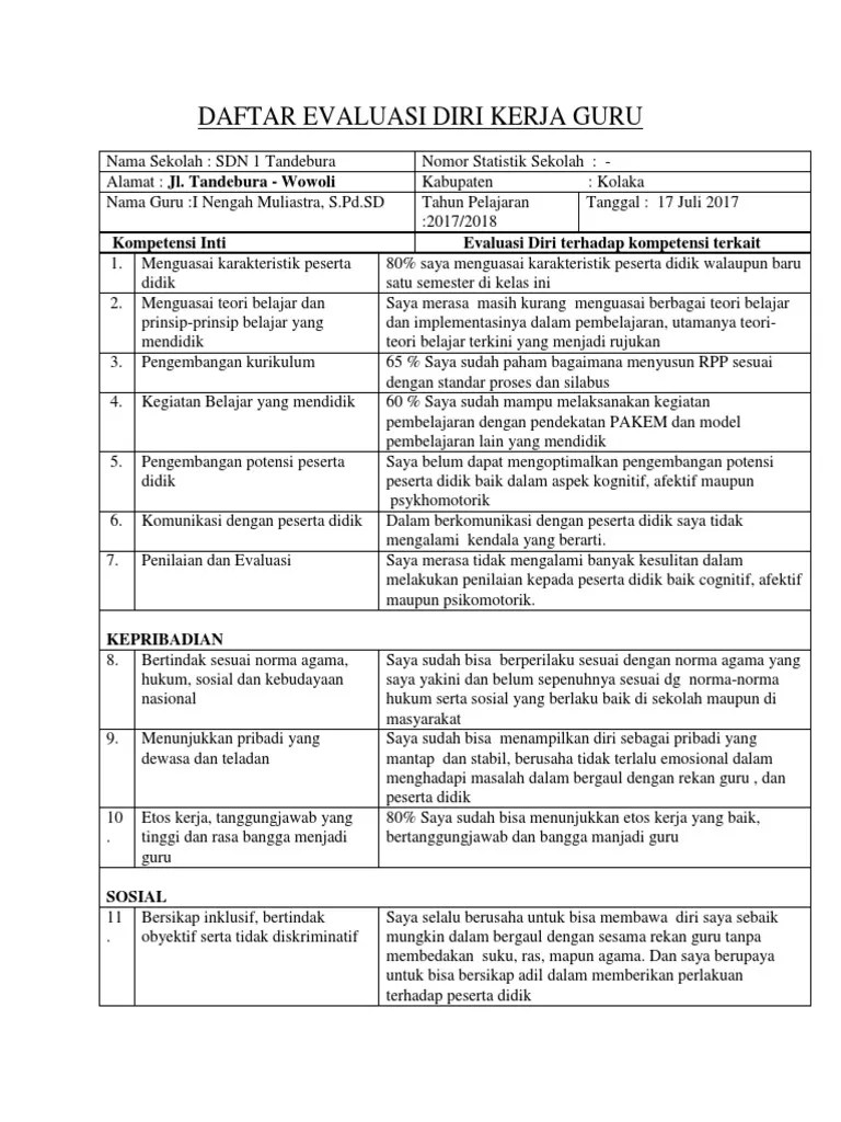 Daftar evaluasi diri kinerja guru pkg program tindak lanjut kinerja guru pkb . Evaluasi diri guru untuk rencana pengembangan keprofesian berkelanjutan. Rencana tindak lanjut pengembangan keprofesian berkelanjutan individu guru nama sekolah alamat nama guru : Kesimpulan berdasarkan hasil analisis data dan pembahasan didapatkan beberapa kesimpulan sebagai berikut: Posted by dunia pendidikan on.